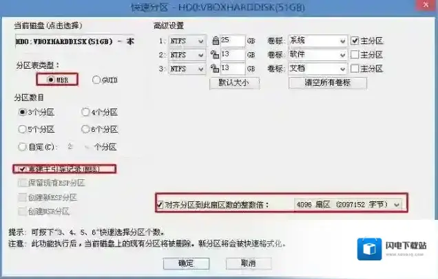 3、转换完成后,执行快速分区,分区大小几磁盘个数自己选择,确保分区表类型为MbR ,及勾选了重建主引导记录MBR,按下确定后开始分区(对了,如果是固态硬盘可要4K对齐一下哦);