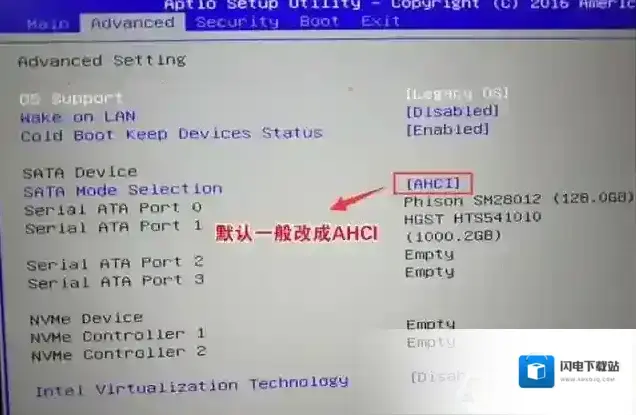 4、再将移动上下方向键,移动到Advanced中将SATA Mode Selection选项的启动项更改为AHCI,否则安装WIN7会出现0x00007b蓝屏,如下图所示,然后再F4保存设置;