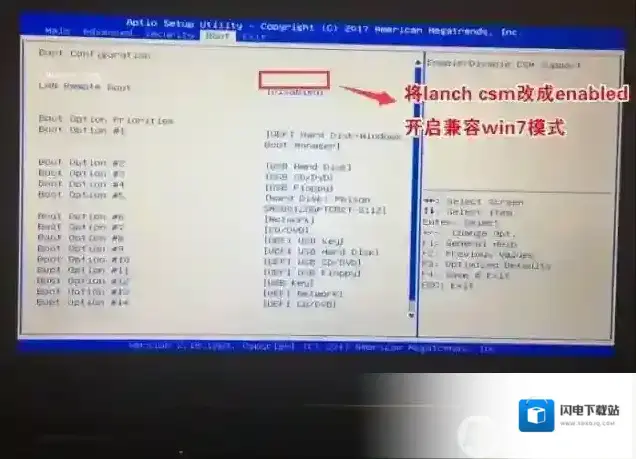 2、再将移动左右方向键,移动到BOOT选项卡下,将Launch CMS更改为Enable,开启兼容模式,如下图所示;