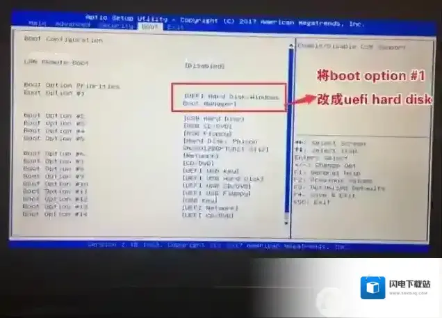 3、再将移动上下方向键,移动将Boot Option #1选项的启动项更改为UEFI Hard Disk:Windows Boot Manager,如下图所示,然后再F4保存设置;