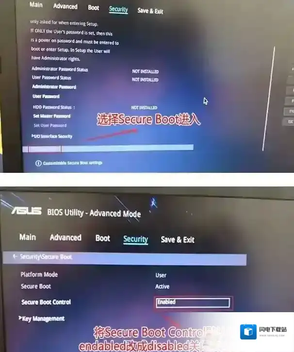 2、进入高级模式后,按→方向键移动到Security,选择Secure Boot,然后回车进入把Secure Boot control选enabled改为disabled关闭安全启动;