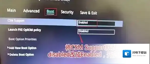 3、再切换到BOOT的选项,把CSM support由disabled改成enabled,开启兼容模式,;