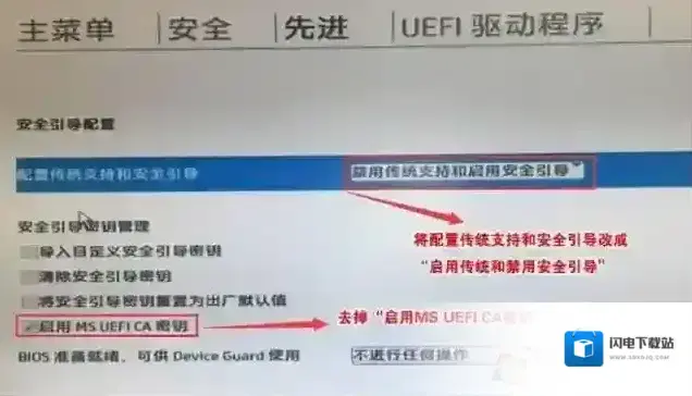 3、回车后,将配置传统支持和安全引导设置电脑“启用传统支持和禁用安全引导”以及去掉“启用MS UEFI CA密钥”前面的勾,然后按F10保存更改;