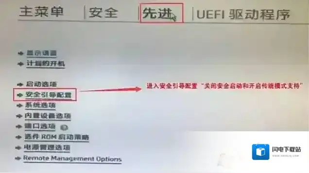 2、进入BIOS后,将移动键盘到“先进”选项下,选择”安全引导配置”,按回车键进入设置;