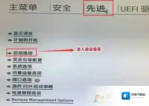 5、F10保存重启后再次开机按ESC,然后选择F10进入BIOS设置,将鼠标移动“先进”选项中,选择”启动选项”后回车进入,如下图所示;