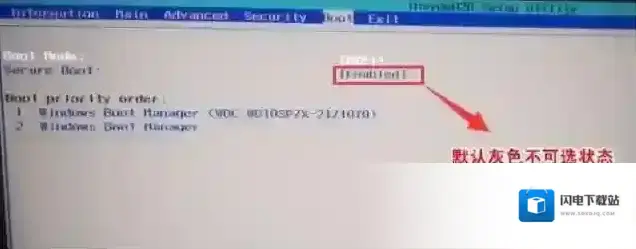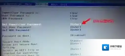 2、如果Secure Boot灰色无法设置,则转到Security,选择Set Supervisor Password回车设置密码,再返回BOOT选项,将Secure BOOT默认enabled为disabled,(注:改完secure boot后再设置密码为空即可,要不每次进BIOS都要设置)如下图所示;