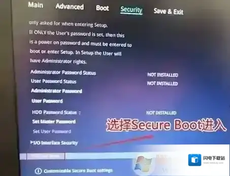 2、进入高级模式后,按→方向键移动到Security,选择Secure Boot,然后回车进入把Secure Boot control选enabled改为disabled关闭安全启动,装win7必须关闭安全启动,如下图所示;