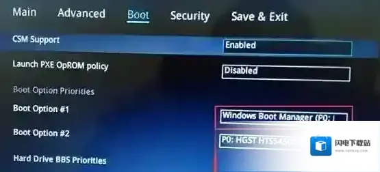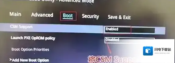 3、再切换到BOOT的选项,把CSM support由disabled改成enabled,开启兼容模式,如下图所示;
