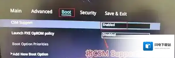 3、再切换到BOOT的选项,把CSM support由disabled改成enabled,开启兼容模式,如图所示: