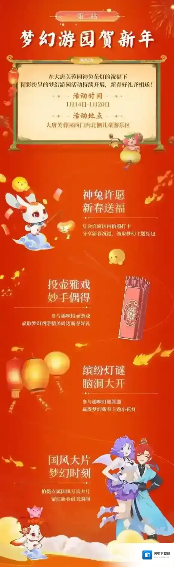 除了欣赏流光溢彩的神兔花灯,精彩纷呈的梦幻游园活动也将陆续开展–在神兔许愿区分享新春祝福可领取梦幻主题红包,原汁原味的仿古趣味投壶可赢取梦幻西游精美周边,更有让人脑洞大开的缤纷灯谜、专属国风写真活动,留住新春最美瞬间还可获梦幻主题相框。