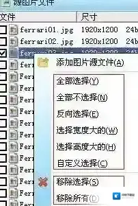 3、点击工具栏中的按钮“添加图片源文件”,或者使用主菜单〖文件〗- 〖添加图片源文件〗,添加源文件到左侧的列表;4、在左侧列表中使用鼠标点击钩选需要转换的图片文件,也可以使用主菜单〖操作〗中的菜单项或鼠标右键菜单项进行选取,菜单项包括:全部选择、全部不选择、反向选择、选择宽度大的、选择高度大的、自定义选择,使用〖自定义选择〗菜单项可以按照图片的格式、尺寸进行图片选取;