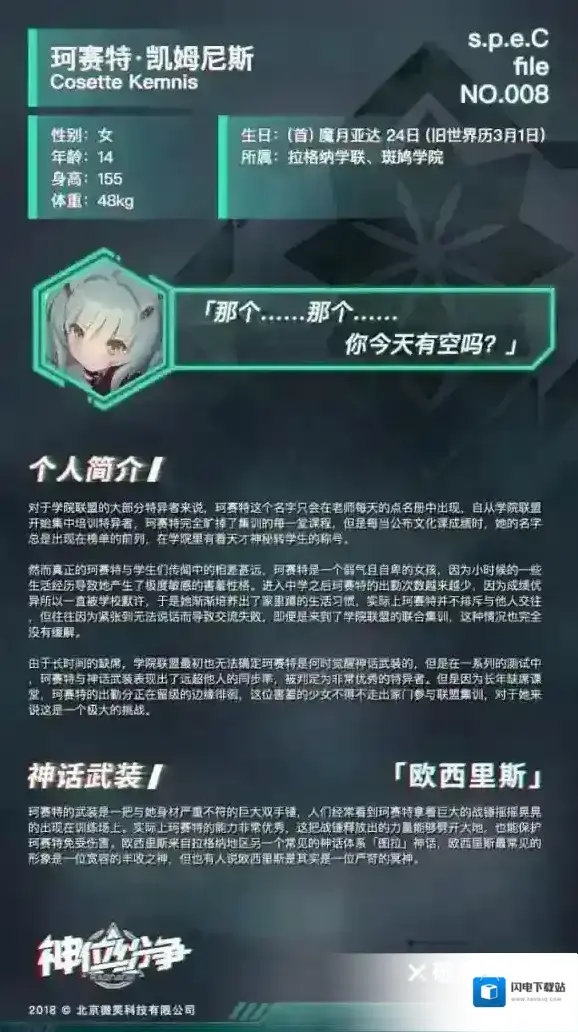 《神位纷争》珂塞特是谁。《神位纷争》珂塞特简介。珂塞特是《神位纷争》中的No.8特异者,是一个弱气怕生的少女。那么珂塞特有什么的故事,使用什么样的武器,一起来看下她的人物介绍吧。