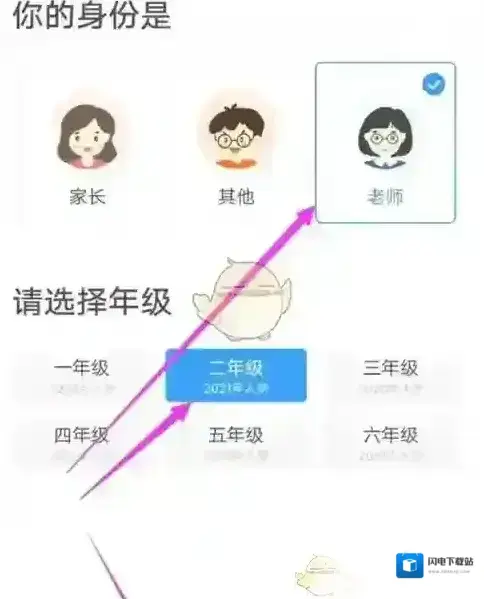 4、在弹出的设置窗口中,选中老师身份,选中二年级,点击确定完成。