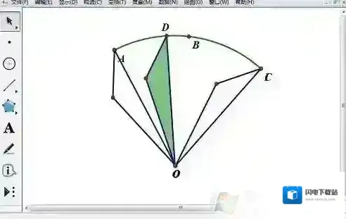4、选中三角形复制粘贴2次,一个放在A点处,一个放在C点处,将顶点都拖到圆心处与圆心重合。选中点D、点E、点O,选择“构造”–“三角形内部”,去掉多余的标签;