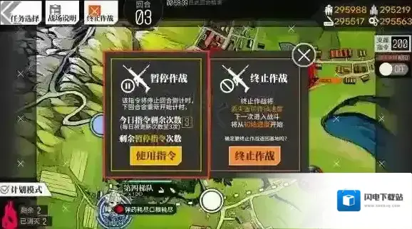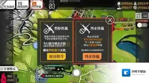 在这边说明一下终止作战左边的选项:暂停作战 暂停作战指令是用于停止当前回合的回合数倒计时,这样上方红框内就不会继续倒计时当前回合的作战时间(这种功能建议用于坠入兔洞等情况使用,一天只有三次机会要注意)