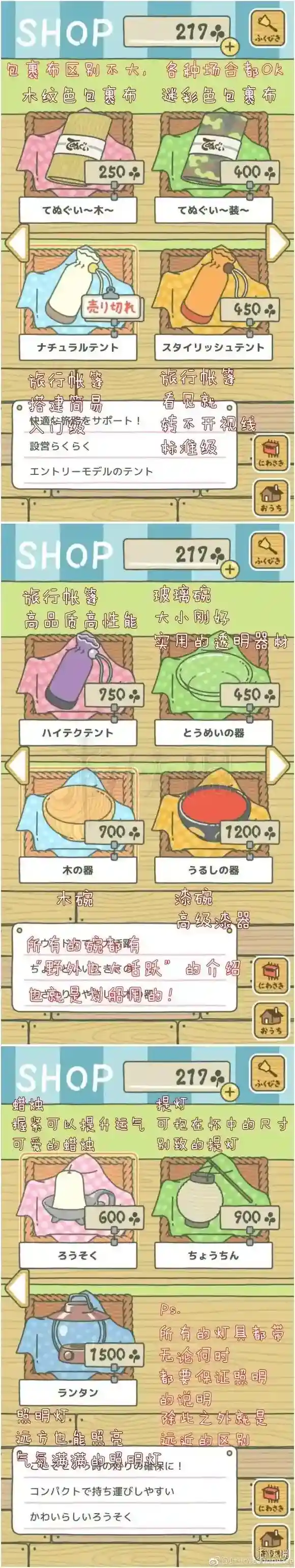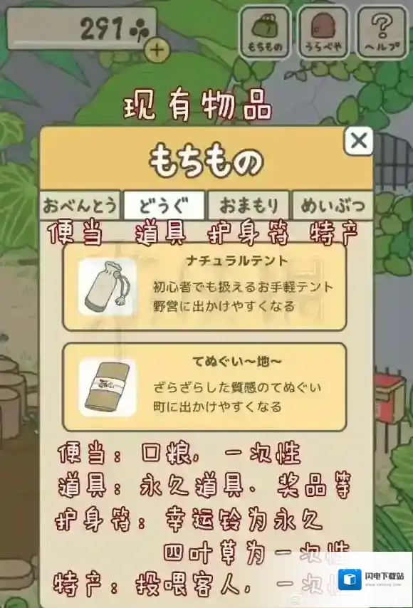 5、现有物品包括便当(口粮)、道具、护身符和特产。便当和道具基本都可以在商店买到,具体的使用请见图。注意暗示天气和返回速度的口粮,防止迷路的灯具,以及可能带来好收获的护身符。碗的作用是划船,包裹布和帐篷不同款式的区别不大,基本可以随便买。