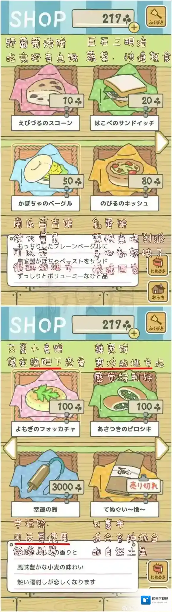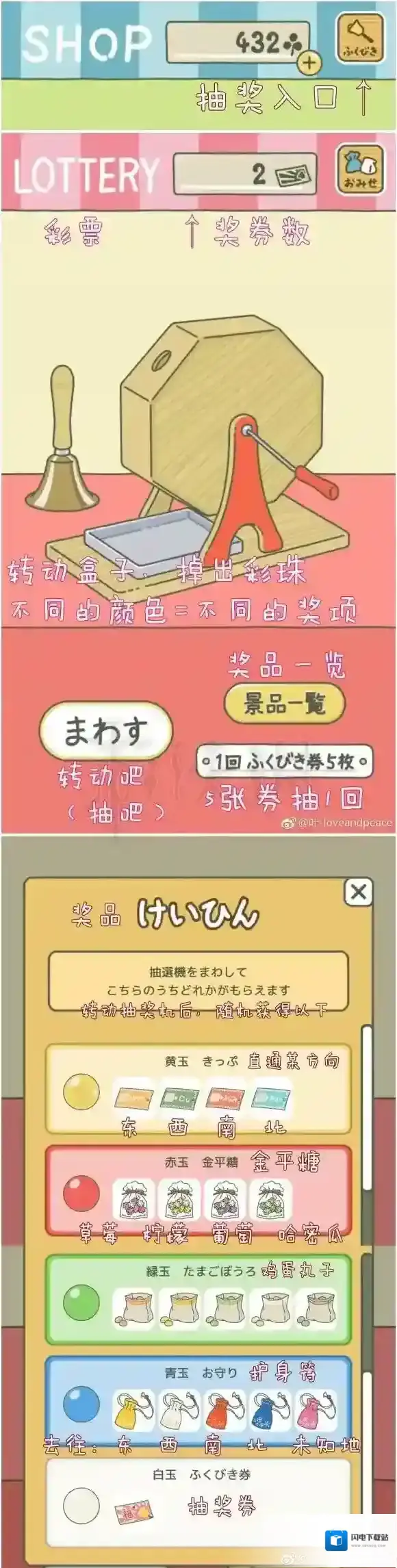 6、商店右上角还有万恶的抽奖,5张券来一发,奖品内容见图。抽奖券可能由蛙旅行带回,朋友也会寄来,购物时还会随机掉落。