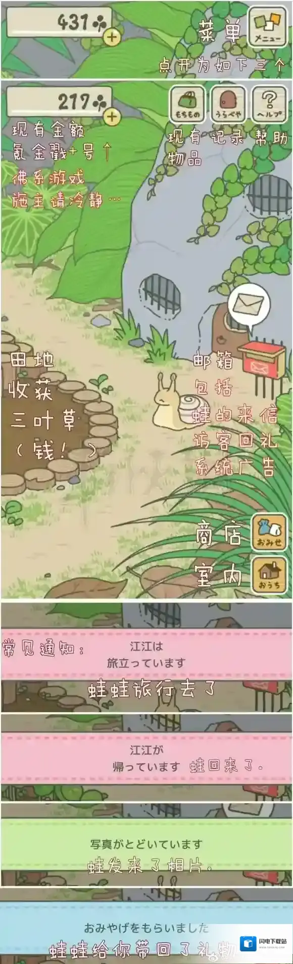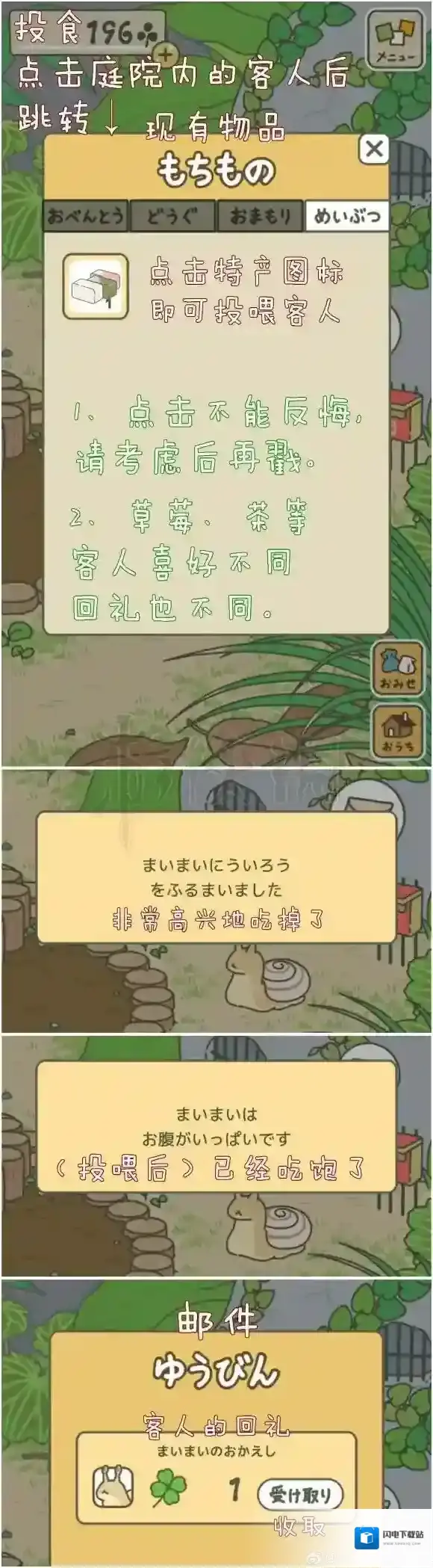 9、庭院里可能会有蛙蛙的朋友来访,比如蜗牛。用特产对访客进行投喂,等访客回家以后,就会写信送来回礼。不同的访客有不同的喜好,会给你不同的礼物。(蜗牛吃卷心菜、辣椒会很开心,给更多好东西;蜜蜂喂水果特别是草莓,乌龟喝茶。)