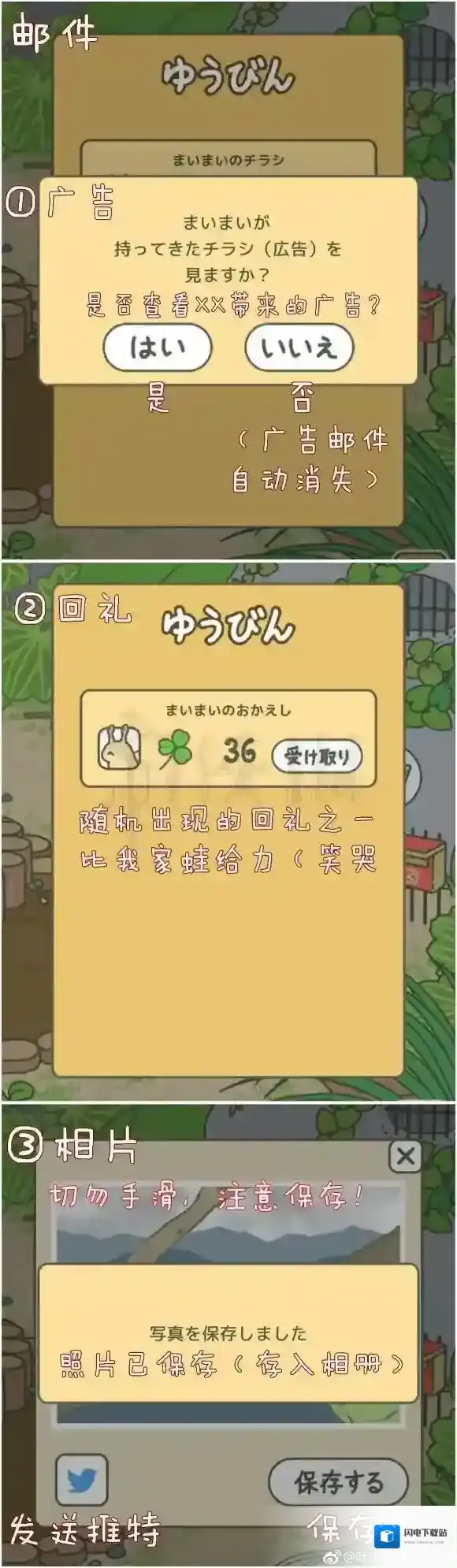 8、出发啦~蛙蛙在旅途中会获得照片(风景图鉴)、当地特产、珍品(隐藏掉落)以及抽奖券,还会随时给你写信。