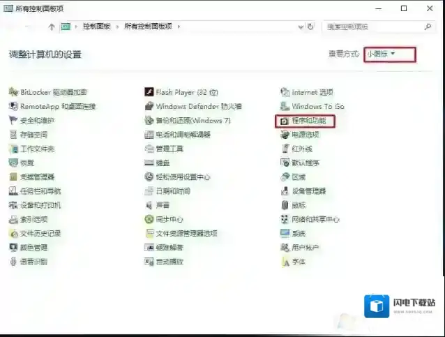 2、来到控制面板,选择查看方式为小图标,然后点击程序和功能;