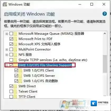 4、勾选SMB 1.0/CIFS File Sharing Support 选项,确定;