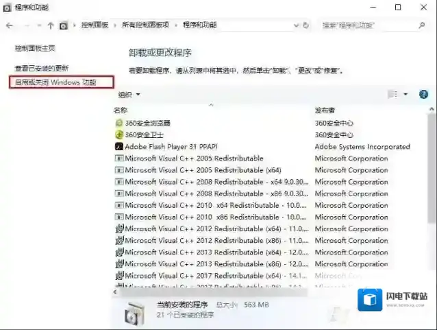 3、点击启用或关闭Windows功能选项;