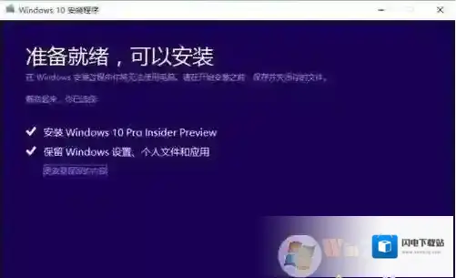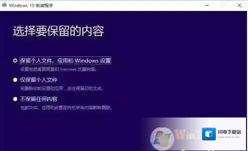 7、此处可以看到,允许安装专业版Win10 和 保留所有设置,点击” 更改要保留的内容 “,会打开如下界面,此处在没有修改注册表的时候会直接进入到如下界面(但是因为本人忘记截不修改注册表时此界面的)相差就在第一个选项是不允许点击的,只允许第二、三个选择;