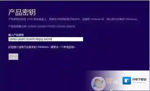 4、更改完如上注册表后,在运行,iSO包中的setup.exe 会弹出输入密钥,因为此版本是专业版,使用企业版的密钥也不能够安装,提示密钥无效,必须用专业版密钥;