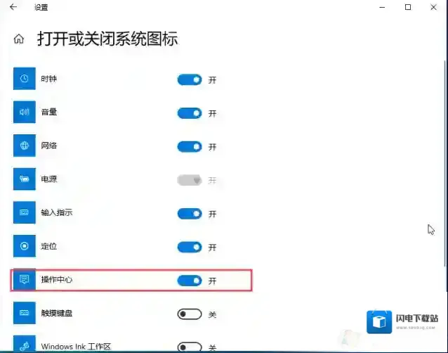 3、最后,我们在打开或关闭系统图标中,把操作中心设置为“开”即可