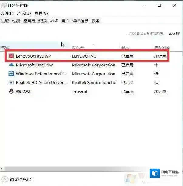 1、打开任务管理器,启动中找到“LenovoUtilityUWP”,确保为启用状态;