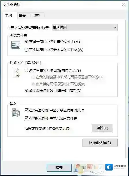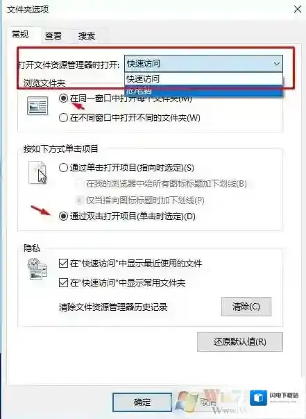 5、在常规界面下,可以设置 打开文件资源管理器时是快速访问还是此电脑、我们还可以设置文件夹是新窗口打开还是在同一窗口打开、是使用单击还是双击,及清除最近使用的文件 等各项设置;