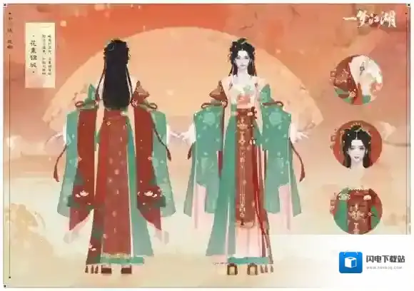 女少侠乌黑秀发之间有蕊蕊簪花装点,娇俏可爱;胸前绽放的蜀绣芙蓉精致典雅,灿烂夺目。花瓣样设计、剪裁的裙摆腰身层层叠叠,勾勒出婀娜身段。而细腻的鎏金纹路让裙袍更显隆重精致,光耀炫目。