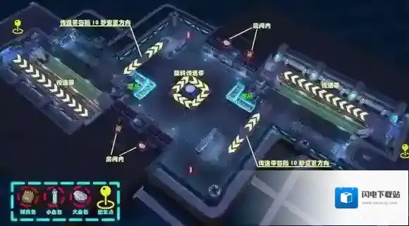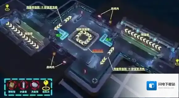 一眼看上去,占点地图和死斗地图似乎差不多??(侧滑一定又偷懒啦!)不过仔细看上去还是有一丢丢区别的嘛~中央战场标出了占点区域,同时取消了旋转传送带中间的障碍物(狙击枪表示能打穿占点了!) 占点模式下,持久战与消耗战变得更为频繁,作为重要补给来源的血包与弹药包自然是争夺的焦点,比起空空如也的占点区域,两边的房间则提供了大血包和弹药包作为补给,占点的小伙伴们在确保了对占点区域的压制后,大可冲出去争夺补给喔~此外,在传送带的尽头也有一份小血包加入了豪华午餐~