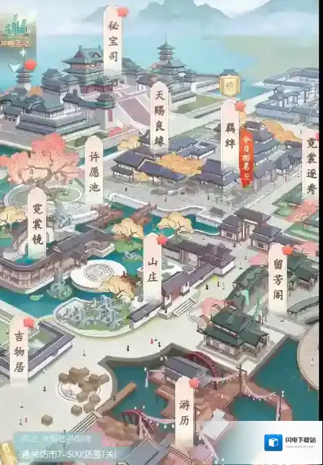 主城设计成了热闹的街市,时有行人飞鸟穿梭而过。各式造型各异的建筑与游戏内的特色玩法结合。