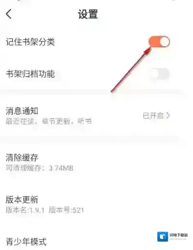 3.这时候我们就可以在打开的页面上,选择记住书架分类功能选项,将其开关按钮点击开启即可。