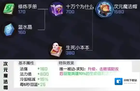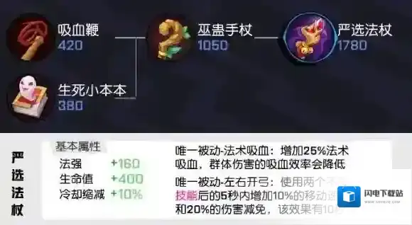 点评:提供法强生命和减CD,被动是吸血,提升雷震子的续航能力。而另一个被动左右开弓在使用两个技能之后能增加移速和伤害减免,在最忌残血时这件装备很实用,并且这个被动CD短。