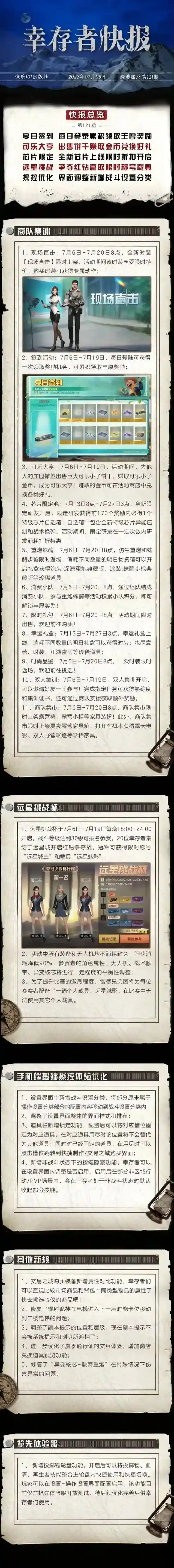 为了充分准备并落实新规我们将从7月6日(周四)早上8点00分-8点30分封闭一切活动场所预计持续30分钟如果在此期间未能完成准备工作封闭时间也将相应延长请各位幸存者奔走相告