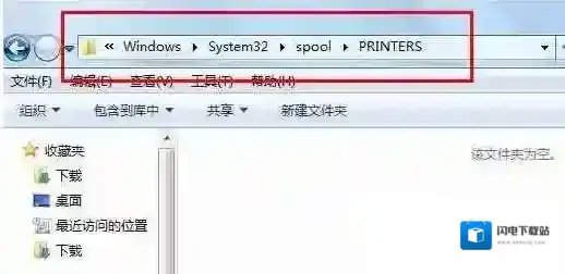 3、依次打开 C:WindowsSystem32spoolPRINTERS 目录,将里面所有的文件删除;