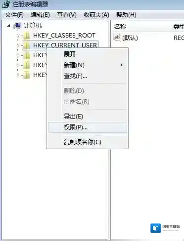 3、打开注册表编辑器后,我们右键点击HKEY_CURRENT_USER项,选择“权限”;打开HKEY_CURRENT_USER权限