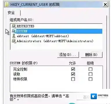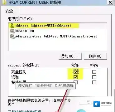 6、接着我们为刚添加的ekbtest帐户添加完全控制权限,如下图,打勾然后确定;