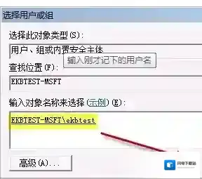 5、在选择用户或组下方对象名称输入框中,填入你需要修复的帐户名称,如果你不记得可以点击“高级”按钮然后“立即查找”来找到登录帐户,选择后单击“确定”;