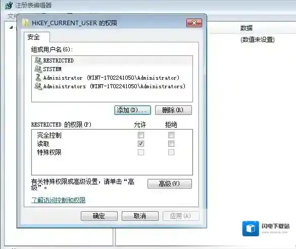 4、然后在弹出的HKEY_CURRENT_USER的权限界面中点击“添加”按钮;