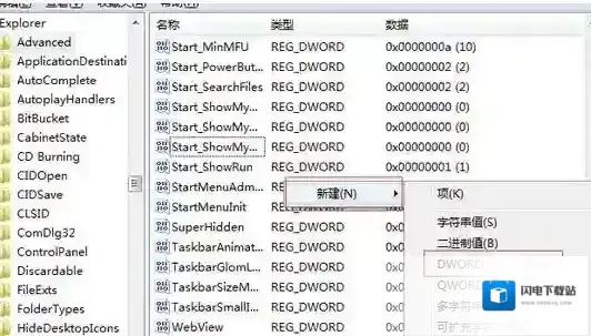 3、点击“Advanced”项后,在窗口右边,单击右键,选择“新建”–“DWORD(32-位)值”,将该值命名为“ThumbnailLivePreviewHoverTime”;