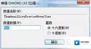 4、双击打开刚创建的“ThumbnailLivePreviewHoverTime”,对里面的数值数据进行修改,输入500就等于是0.5秒,以此类推,可以自行设置,设置完之后,点击确定,然后重启计算机就可以看到效果。