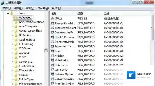 2、在注册表中,依次展开“HKEY_CURRENT_USER-Software-Microsoft -Windows-CurrentVersion-Explorer-Advanced”;