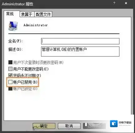 3、在Administrator属性界面中,取消勾选“帐户已禁用”,点击确定即可;