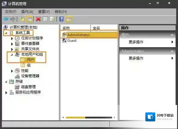 2、展开至计算机管理 系统工具 本地用户和组 用户,在右侧找到并打开Administrator;