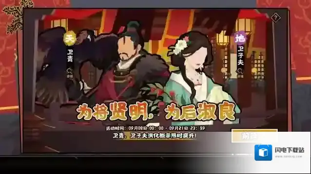上将之元-卫青和嘉夫德若斯-卫子夫限时演化卡池也将同步上线,“为将贤明,为后淑良”。