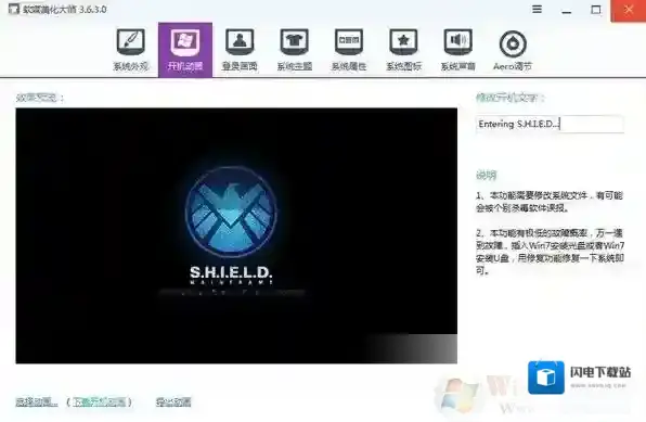 3、以《神盾局(S.H.I.E.L.D.)开机动画》为例,选中之后看下效果,满意的话也可以修改动画下面的文字,改好后点击“应用到系统”(Win7系统之家 m.winwin7.com)