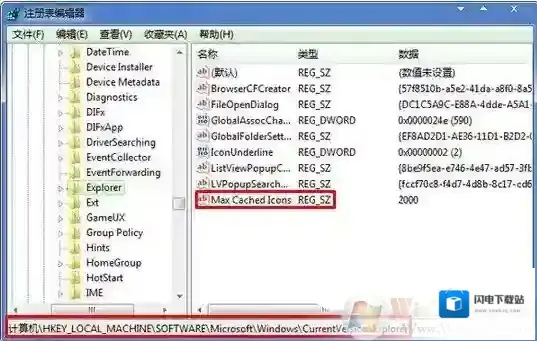 2、接着在打开的深度win7纯净版注册表编辑器中,从左侧分别展开如下分支:HKEY_LOCAL_MACHINE / SOFTWARE / Microsoft / Windows / CurrentVersion / Explorer,然后在右侧窗格中找到键值名为Max Cached Icons。如果查找到不到该键值,可以在右侧窗口中空白位置处“新建”-“字符串值”,然后再将其重命名为Max Cached Icons。